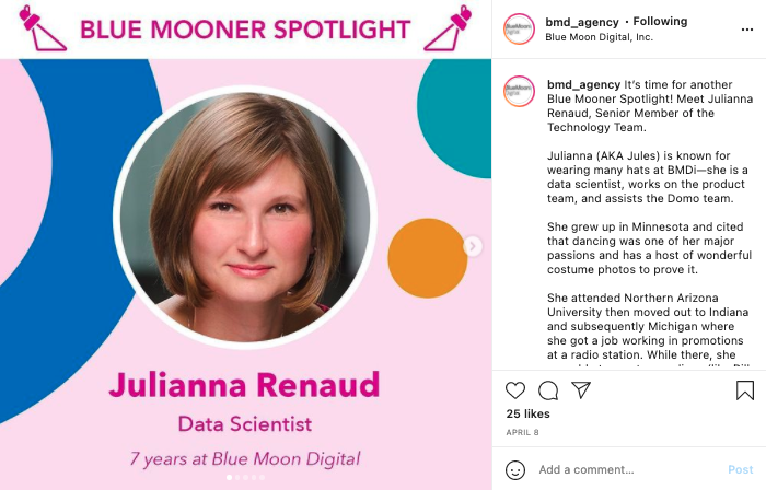 Yea, some companies may post a spotlight here and there but we love seeing a consistent series! Blue Moon Digital’s signature graphic of the spotlight, photo of the employee, title, and number of years on the job looks great! Plus, the capture adds an added element of detail.Â